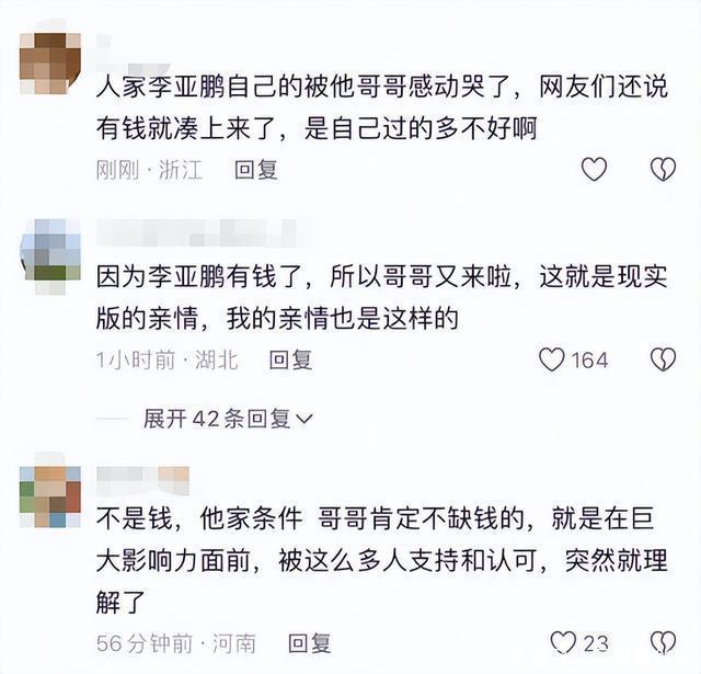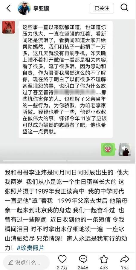 都知道李亚鹏这几年一直是一个人扛着,没想到今年春节,他在社交平台上发了条让人看完有点鼻酸的动态,是他跟哥哥李亚炜年轻时的合影,配文说春节收到哥哥发来的长短信,反复读了好几遍,直接泪目了。 这一看就不是普通的兄弟互动,毕竟这俩人已经有整整18年没怎么联系了。 事情要从2008年说起,当时李亚鹏在娱乐圈正红,拉着哥哥一起投丽江雪山艺术小镇,哥哥李亚炜持股0.35%,结果这个项目后来遭遇困境、亏损严重,债务纠纷就这么把兄弟俩给搅散了,从那之后,两人关系慢慢降到冰点,几乎不再往来。 说起来,李亚炜曾为这个家庭付出的不少,父亲1999年走了以后,哥哥从新疆带着妈妈进了北京,给弟弟当经纪人,就连李亚鹏的生活费,也是哥哥在垫,谁也没有想到,曾经全力支持弟弟的哥哥,却在李亚鹏成名后,因为生意纠纷走到形同陌路。 18年里,哥哥李亚炜结婚、生孩子,这些事李亚鹏一概不知,亲侄儿都11岁了,这当叔叔才第一次知道孩子的存在,这个隔阂的程度,比很多普通家庭的矛盾还深。 这次是哥哥主动发的消息,春节档口,一条长短信发过来,里面的内容让李亚鹏看了一遍又一遍,哥哥家人还一起捐了一万多块,钱虽不多,但这份主动开口的心意,才是最难得的。 在娱乐圈里,亲兄弟因合伙生意反目的情况并不少见,能在多年隔阂后重新握手的,真的不多。 李亚鹏这次晒出来的老照片里,哥哥李亚炜戴着墨镜,身穿风衣,那股子阳刚劲儿一点不输弟弟,兄弟俩站一块儿,同色系风衣加黑裤子,妥妥的帅气兄弟档。 这18年里,李亚炜也没有消沉度日,凭着多年管理经验在好几家企业做了高管,自己从债务阴影慢慢走出来了,日子过得低调安稳,这次主动联系弟弟,也让不少网友称赞他格局很大。 有网友说:”哥结婚生孩子都没通知弟弟,误会肯定不小,这次主动发信才是真的放下了“ 第二个网友说:"两兄弟年轻时候的照片放一起,哥哥颜值完全不输李亚鹏啊,感觉当年没走演艺这条路真的可惜了。" 李亚鹏的妈妈今年83岁,之前还有人拍到老太太开车接送儿子,身体看着挺硬朗的,55岁的儿子,83岁的妈妈,还有刚刚和解的哥哥,这个春节对李亚鹏来说大概是近几年最不一样的一个。